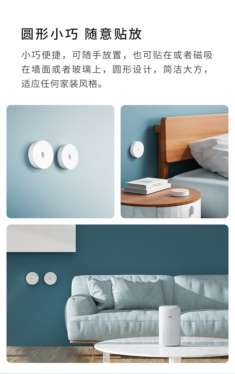 全新圓形小巧外觀,三種按鍵動作升級智能遙控體驗。無需布線接線,還可隨意粘貼當做門鈴或呼叫器使用。米家全屋智能的必備神器,為用戶帶來更加便捷的智能體驗!