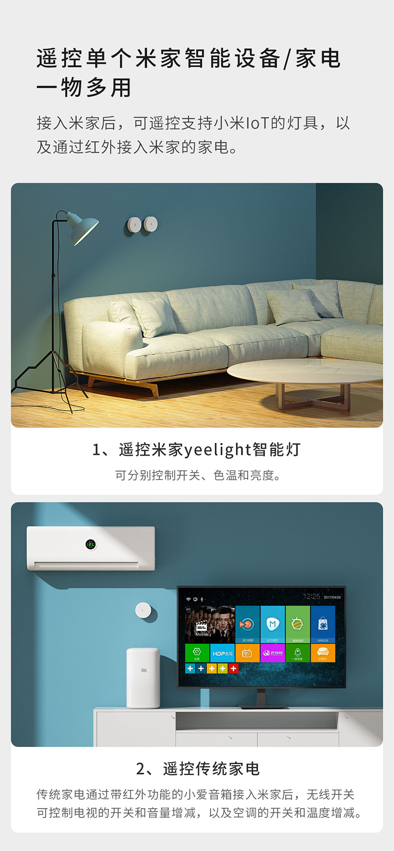 采用藍牙5.2協議,通過具有藍牙網關功能的設備接入米家后,遙控接入米家的智能燈具及家電。隨心調節家里智能燈具的開滅、亮度及色度;控制傳統家電如電視機的開關和音量增減,空調的開關和溫度增減。