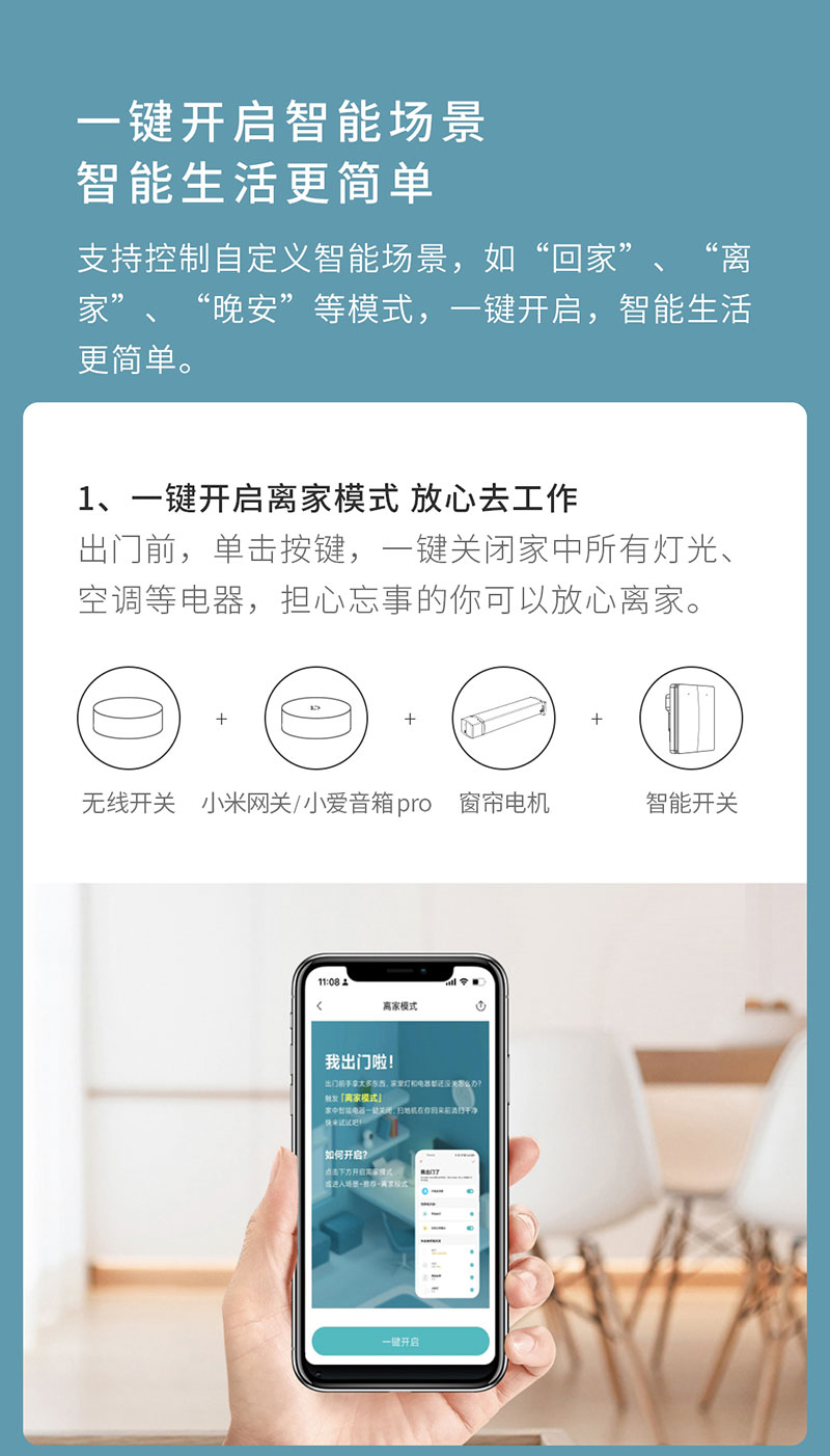一鍵執行離家場景:出門工作前單擊按鍵,聯動家里的智能開關、家用電器,即可關閉所有燈光、空調等設備;