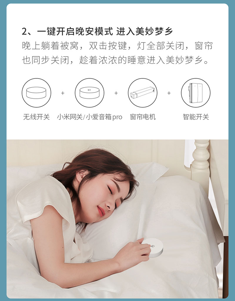 一鍵進入晚安模式:晚上躺在被窩里雙擊按鍵,聯動臥室的智能開關及窗簾電機,燈全部關閉,窗簾也同步合起;