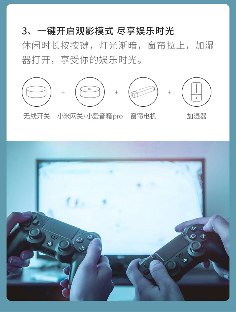 一鍵開啟觀影場景:休閑時長按按鍵,聯動客廳的智能燈具、窗簾電機及加濕器等設備,燈光漸暗,窗簾拉上,加濕器打開,享受閑適的娛樂時光。