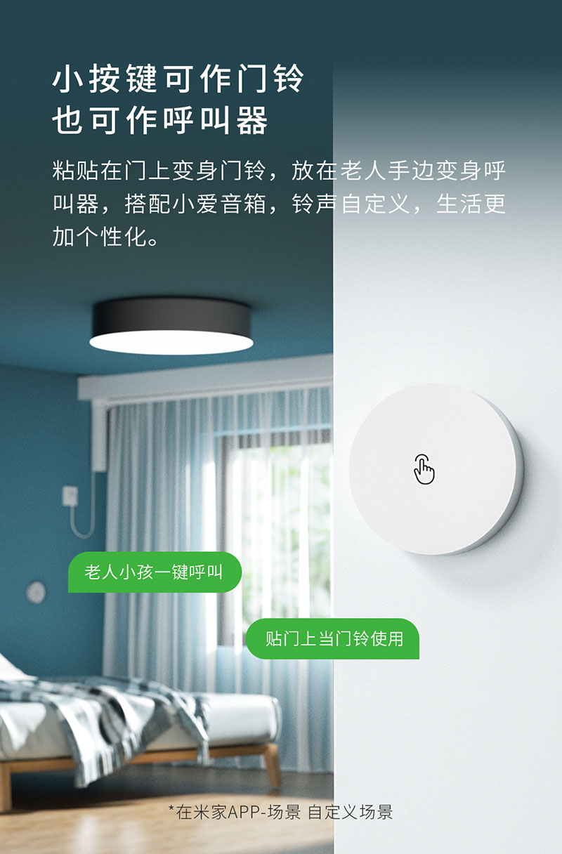 可將藍牙無線開關粘貼在門上或老人房床頭位置,直接與帶有藍牙網關功能的小愛音箱配對使用,在場景中自定義按鍵呼叫鈴聲,無線開關即刻變身門鈴/呼叫器。小小的身材,每時每刻的貼心守護。