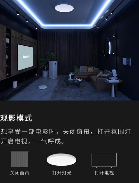 如果是一個人獨居,想打造家庭影院效果的,也可以設置“觀影模式”,關閉窗簾,打開氛圍燈,開啟電視播放電影,就可以在家享受慵懶時光啦。