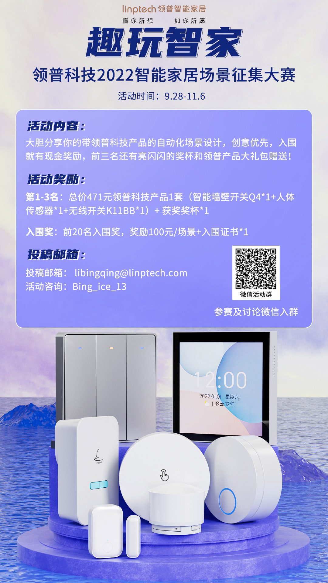 今天就給你機會大膽開麥~我們專門舉辦了一場“趣玩智家——2022領普科技智能家居場景征集大賽”,就是為了給你這樣有趣的靈魂一個放飛自我自我展示的機會,只要分享帶領普科技產品的自動化場景設計,入圍就有現金獎勵,前三名還有亮閃閃的獎杯和領普產品大禮包贈送!