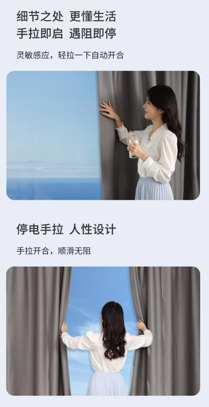 如果家里住了老人,習慣手拉窗簾,也可以手動控制,輕觸即動。在家里停電的情況下,無須擔心窗簾無法拉動,依舊可以做到窗簾正常離合,省心又省力。