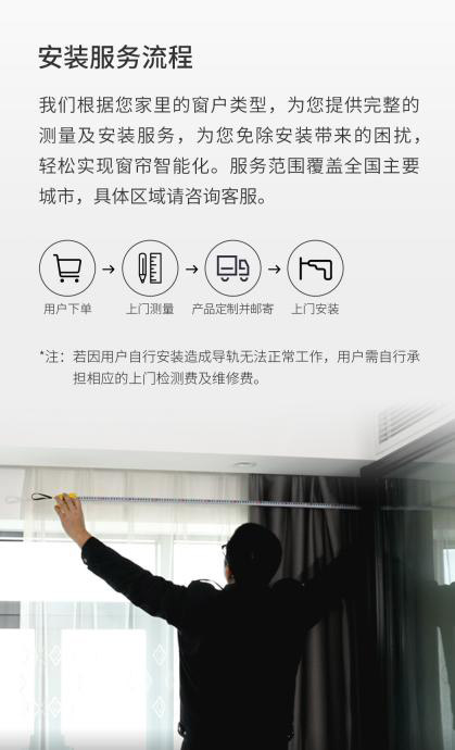 智能窗簾的安裝也是非常方便,用戶下單后師傅上門測量,從而定制產品并郵寄,收到貨后專業團隊上門安裝完成,無需單獨定制軌道,滿足用戶不同需求,一邊更順利地進行窗簾智能改造。